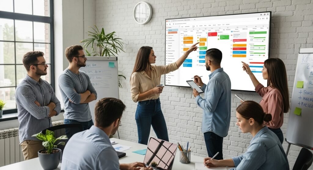 The project management tools enable teams to monitor their workload through task monitoring and deadline management and responsibility distribution. The system helps teams maintain their shared focus through its work distribution system which supports their operational needs across different client engagements and project activities.