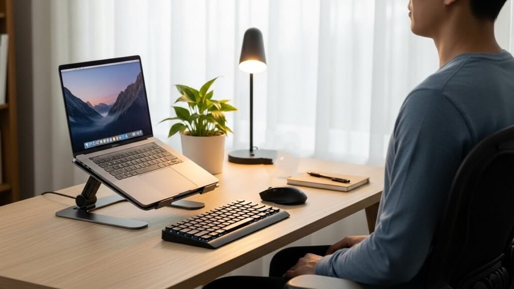 An ergonomic setup improves comfort during long screen time. For example, laptop stands help meet screens to eye level. Small adjustments like this support better focus and physical comfort.