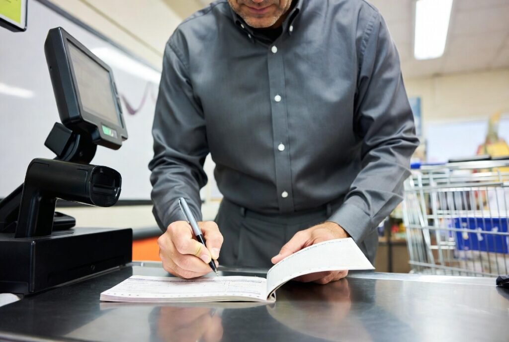 People learned to use checkbooks during their childhood to purchase items such as groceries and rent payments and birthday presents. People used checkbooks as their primary method to monitor their financial activities. People now use instant apps and online banking to decrease their need for check-writing which they hardly ever do at checkout counters.