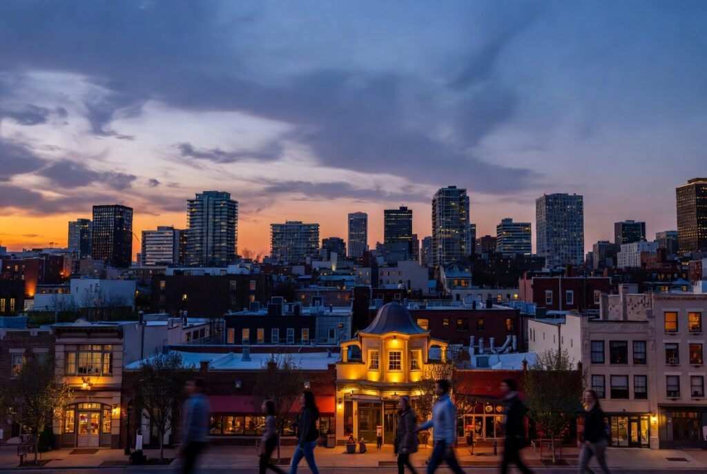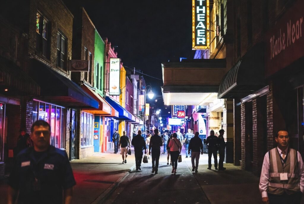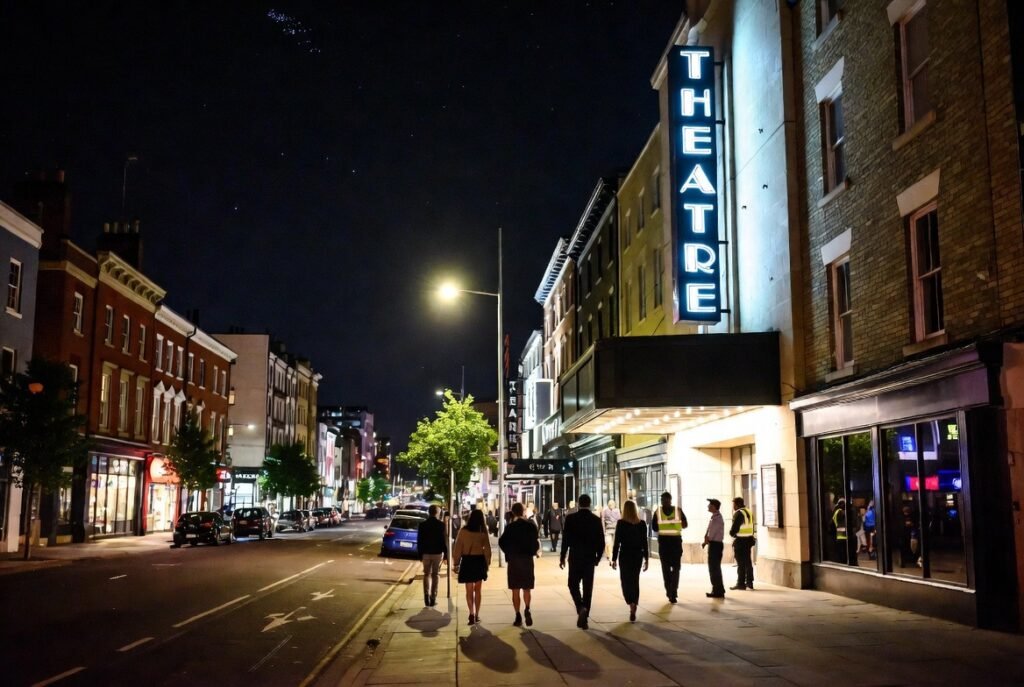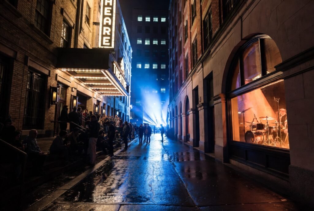 Live performance functions as the primary “pulse” which keeps the city alive. The sound of drum kits travels through alleyways while theater marquees illuminate wet streets in the area. A city becomes more than a work site through its energy which transforms it into a living environment.