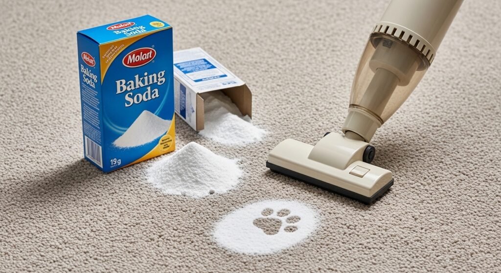 Baking soda works as an effective moisture and smell absorber. You should apply it to the stain and let it stay for several hours before using a vacuum cleaner. The method proves effective for cleaning up pet accidents, spills, and persistent odors.