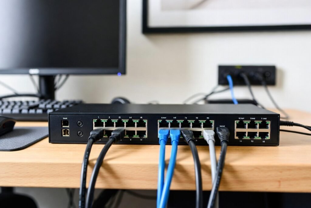 A network switch can be used to increase the reach of the wired devices that are linked to your router. It comes in handy with home offices or media systems, where there are several devices that require connection at high speed and reliability.