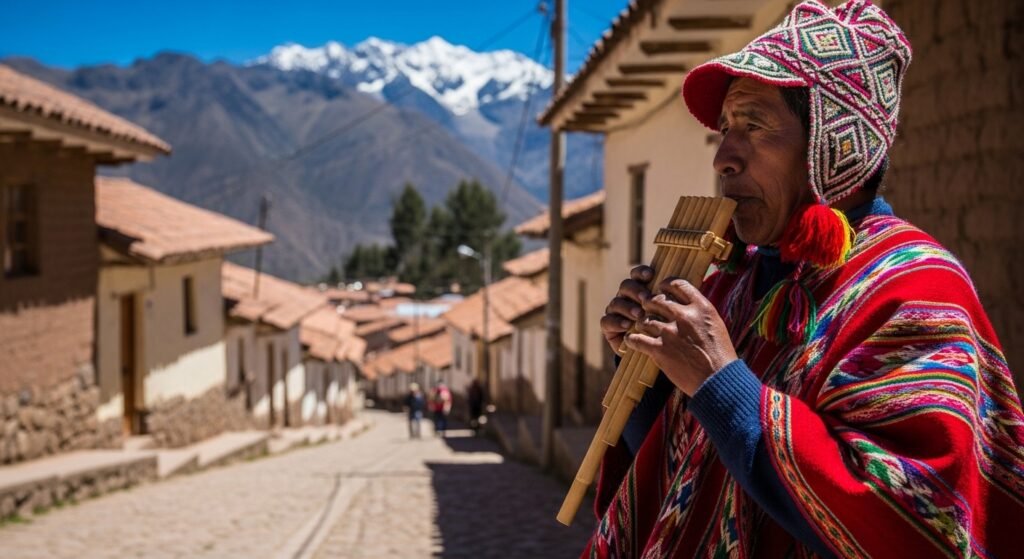 The high-altitude cities of Peru, Bolivia, and Ecuador present street music with a special light musical characteristic, musicians often play the “zampoña” (panpipes) and the “quena” (flute). The musical instruments create sound patterns that represent the Andean Mountain Range which people have used for spiritual and community connections throughout history.